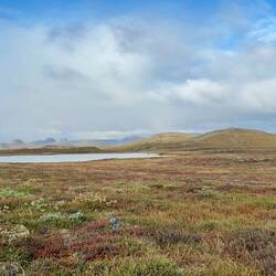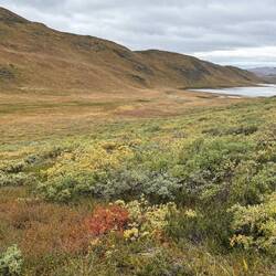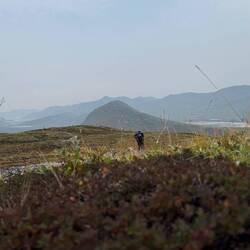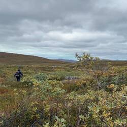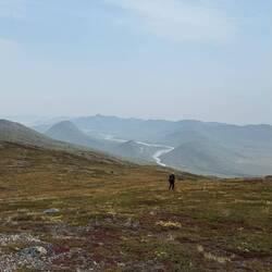 Wie geplant folgen wir der Dirtroad ein paar Kilometer zurück auf der Suche nach einem Platz für unser Zelt. Zum Verständnis: Die „Wiesen“ hier in der Arktis können Knie hoch oder tief sein. Wie man es auch betrachten möchte. Eine flache und ebene Fläche findet man nicht sooooofort oder gar nicht.