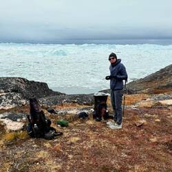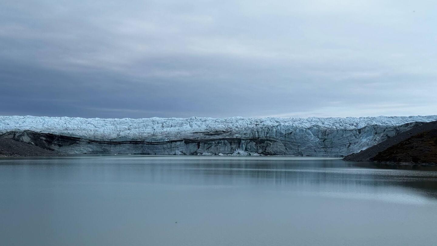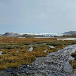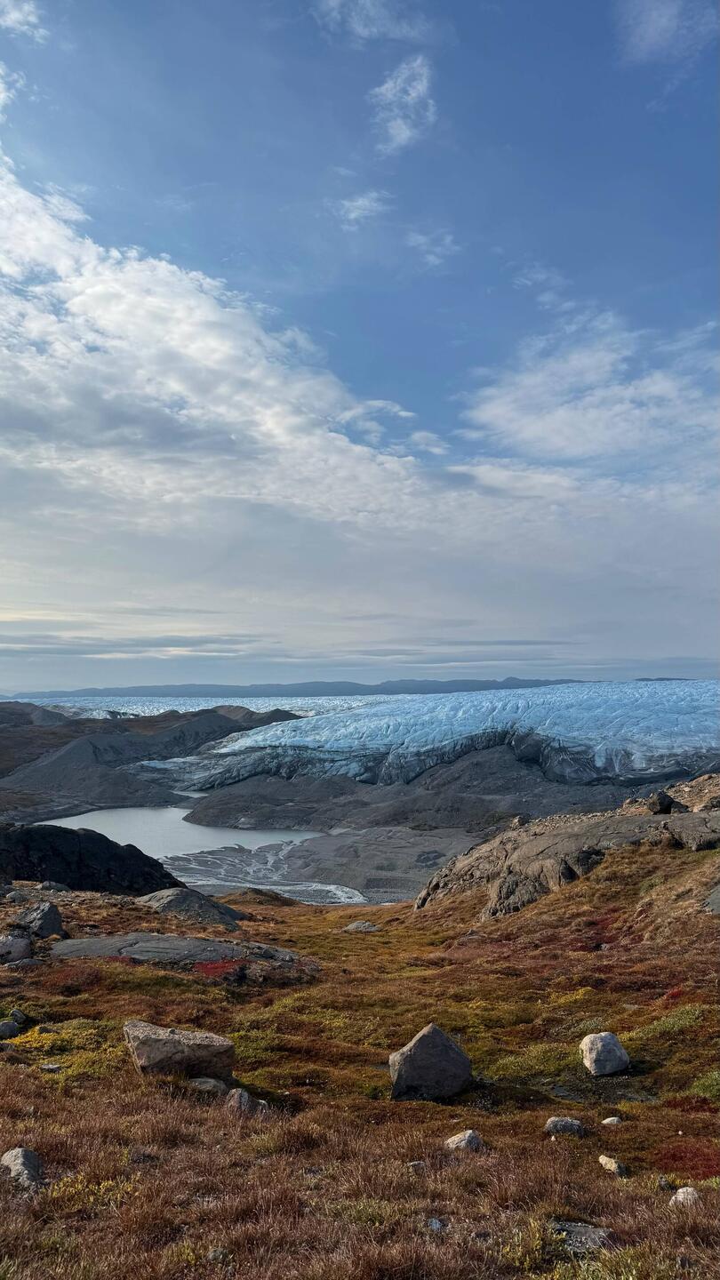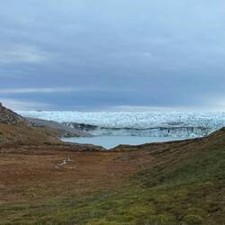 Der kleine Pfad endet an der Dirtroad die bis zum Icecap führt. Wir folgen ihr nur für kurze Zeit. Unser Trail Richtung Russell Glacier führt 2 km rechts von der Straße ab. Auf einen kurzen Anstieg folgt ein kurzer Abstieg, quer durch die sumpfige Wiese und der Glacier liegt vor uns. Wir setzten uns und genießen eine zeitlang die Szenerie, den imposanten Anblick und spüren die abstrahlende Kälte des Eises. Wir lauschen dem knacken des Eises. Regelmäßig rummst und donnert es. Oftmals bricht das Eis im Inneren und fällt unter tosendem Lärm irgendwo runter. Während wir die erste von 11 Portionen unsere eigens kreierten Powermüsli reinlöffeln, fallen riesige Eisbrocken 🧊 aus der Wand und donnern ins Wasser. Der Schall verzögert und so schauen wir meist etwas zu spät hin.