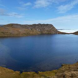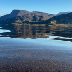 Wir folgen dem Pfad und verlassen dabei die direkte Küstenlinie. Eine rund 230 Meter hohe Felsformation liegt zwischen uns und dem Fjord.