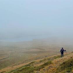 Die ersten Stunden ist es kalt, sehr kalt. Der Nebel bleibt, visuelle Orientierung entfällt fast gänzlich. 🧭 Wir irren etwas umher und versuchen unsere Richtung zu halten. Wir entscheiden, auch wenn es windig ist über die Gipfel der Hügel zu gehen. Hier oben pfeift der eisige Wind. Ja, das ist jetzt für uns eine richtige Herausforderung.