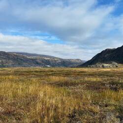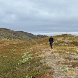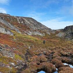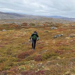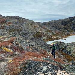 Es dauert doch gar nicht so lang bis wir nasse Füße bekommen. Wir wundern uns nicht, so sind wir doch darauf vorbereitet! Denken wir… Der Ice Ridge Trail startet in Kangerlussuaq und führt über den Bergkam nach Osten Richtung Icecap. Es gibt zumeist keinen richtigen Weg oder Pfad und so laufen wir von Cairn zu Cairn (Steinmännchen) oder versuchen der Linie auf unserem Navi zu folgen. Unseren Eifer setzen wir in Geschwindigkeit um, so haben wir doch einen halben Tag an Zeit verloren! Schnell werden wir vom hügeligen Gelände und den ersten sumpfigen Abschnitten gebremst. Anstrengend! Jeder Schritt sinkt tief in den Boden ein und fordert extra Energie. In der Ferne sehen wir oben auf dem Berg 3 Moschusochsen! Wie krass ist das denn! Ganz toll!