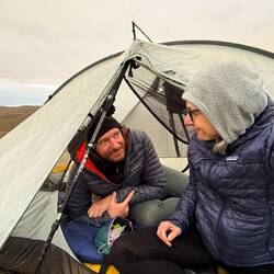 Die Temperaturen waren mit 2 Grad in der Nacht nicht ungewöhnlich tief. Allerdings hat uns der Wind die Wärme aus dem Zelt gezogen und damit auch vom Schlafsack. Windchill im Schlafsack, spannend!