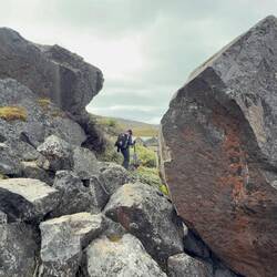 Überall sehen wir riesige Seen, egal wo man hinsieht ist Wasser. Wir laufen Richtung Osten und haben die riesige Eismasse schon seit längerem in unserem Blick. Heute ist es zwar diesig trotzdem können wir recht weit gucken. Beeindruckend wie es zwischen den Bergen immer wieder weiß glänzt. Plötzlich ist ein lautes donnern und Grummel zu hören. Wir stoppen und schauen uns hektisch um. Mehrere Kilometer Süd-östlich ereignet sich grade ein Fels bzw. Bergsturz! Irre, so weit weg und doch so laut. Wow, das müssen große Massen gewesen sein.