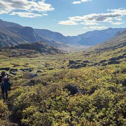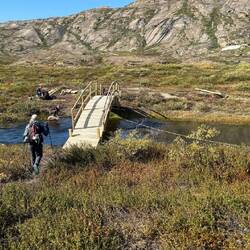 Alex und Franzi on trailNein. Klar können wir unsere Route jetzt ändern, um zurück nach Kangerlussuaq zu kommen. Das wäre dann ein Tourabbruch. Später auf dem eigentlichen „Arctic Circle Trail“ gibt zum Ende hin zwei Varianten. Was wir hier in den ersten Tagen unternehmen macht zu nächst mal kein Wanderer.