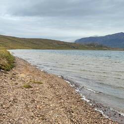 Aber wir mussten ja umplanen und so führt uns unser Weg wieder zurück. Eine weitere Nacht möchten wir an der Steilküste, mit Blick auf die Eisberge verbringen. Auf unserem Weg zurück zur Küste nimmt der Wind nochmals Fahrt auf. Klettern wir höher wird er mehr, klettern wir zu einem See runter wird es weniger. Wir können die Böen auf der Wasseroberfläche auf uns zu rollen sehen und so wissen wir wann es kalt wird.