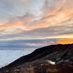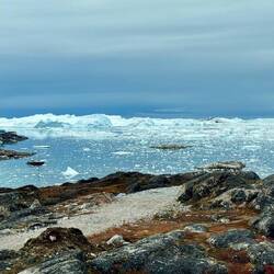 Wir möchten heute noch etwas weiter Richtung Osten laufen und wenn vorhanden, weiter dem Pfad folgen. Wir werden sehen wie weit wir kommen. Da wir kein direktes Ziel auf unser Route haben, geniessen wir den Morgen mit Blick auf den Icefjord und machen langsam um 10:30 Uhr los. Der Blick auf die Eisberge ist etwas besonderes, was wir hier oben weit oberhalb des Polarkreises erleben möchten.