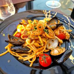 Notre dernière soirée au Tessin, alors mettons les petis plats dans les grands et le petit rosé qui va bien, tout cela au restaurant La Perla à Ponte Tresa jolie petite ville entre Suisse etLes mer