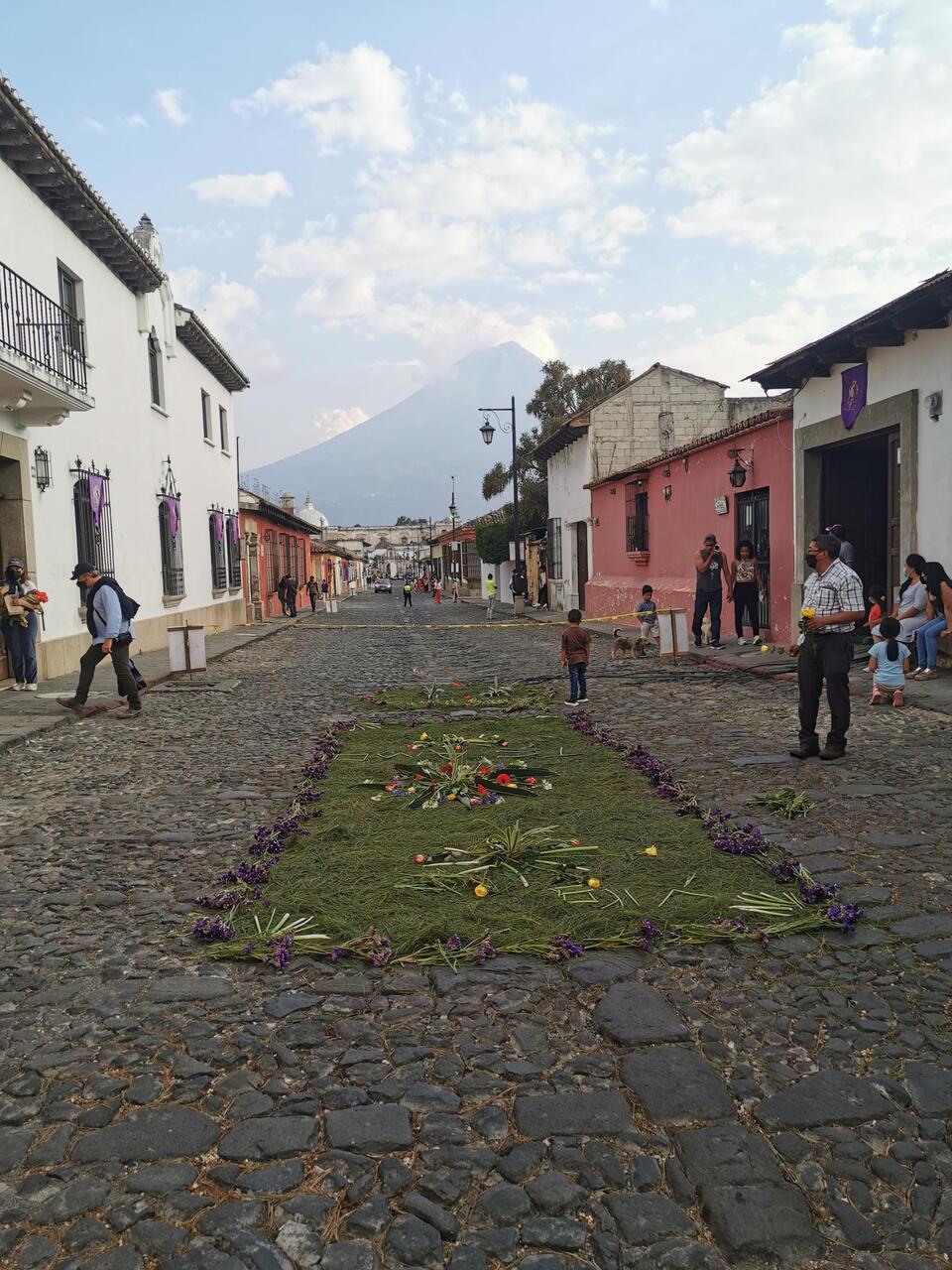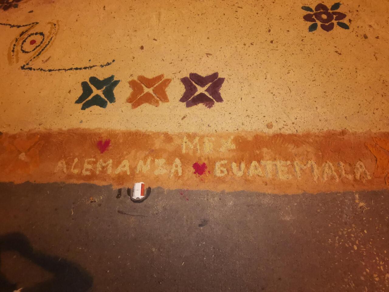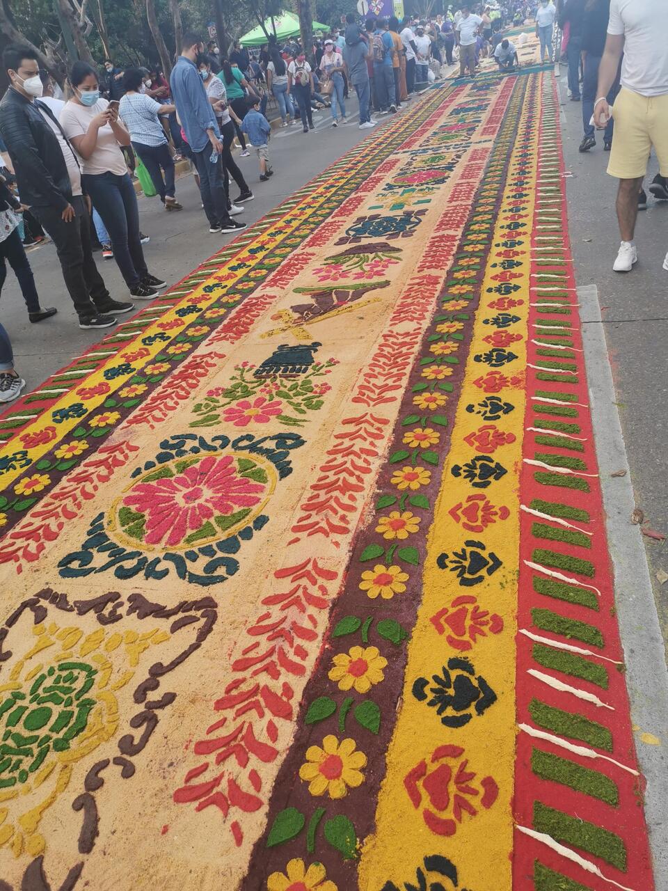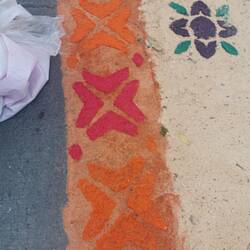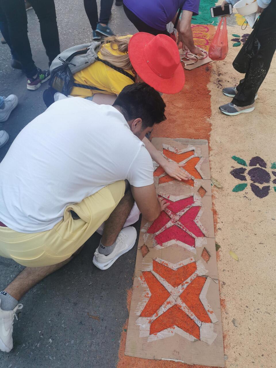 Für die zweite Prozession am Abend wurde die Hauptstraße gesperrt. Zahlreiche Freiwillige legen "Teppiche" aus bunten Sägespänen aus, über die die Prozession dann läuft.