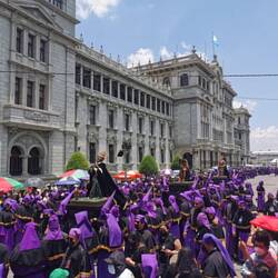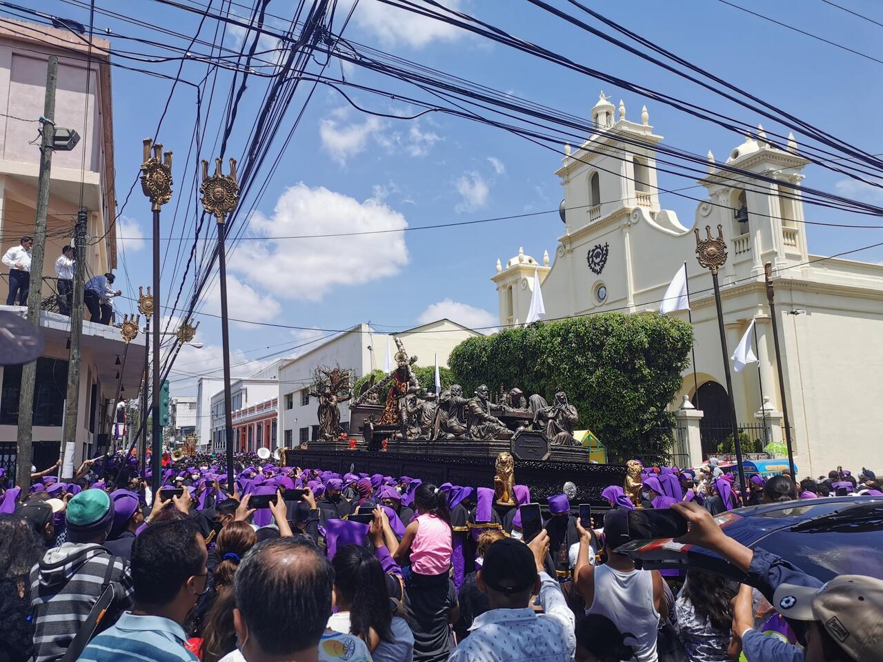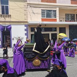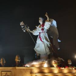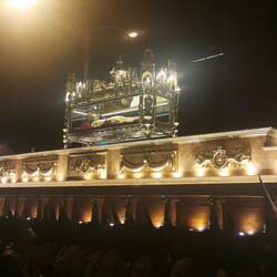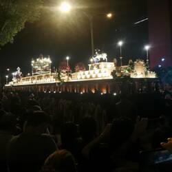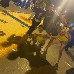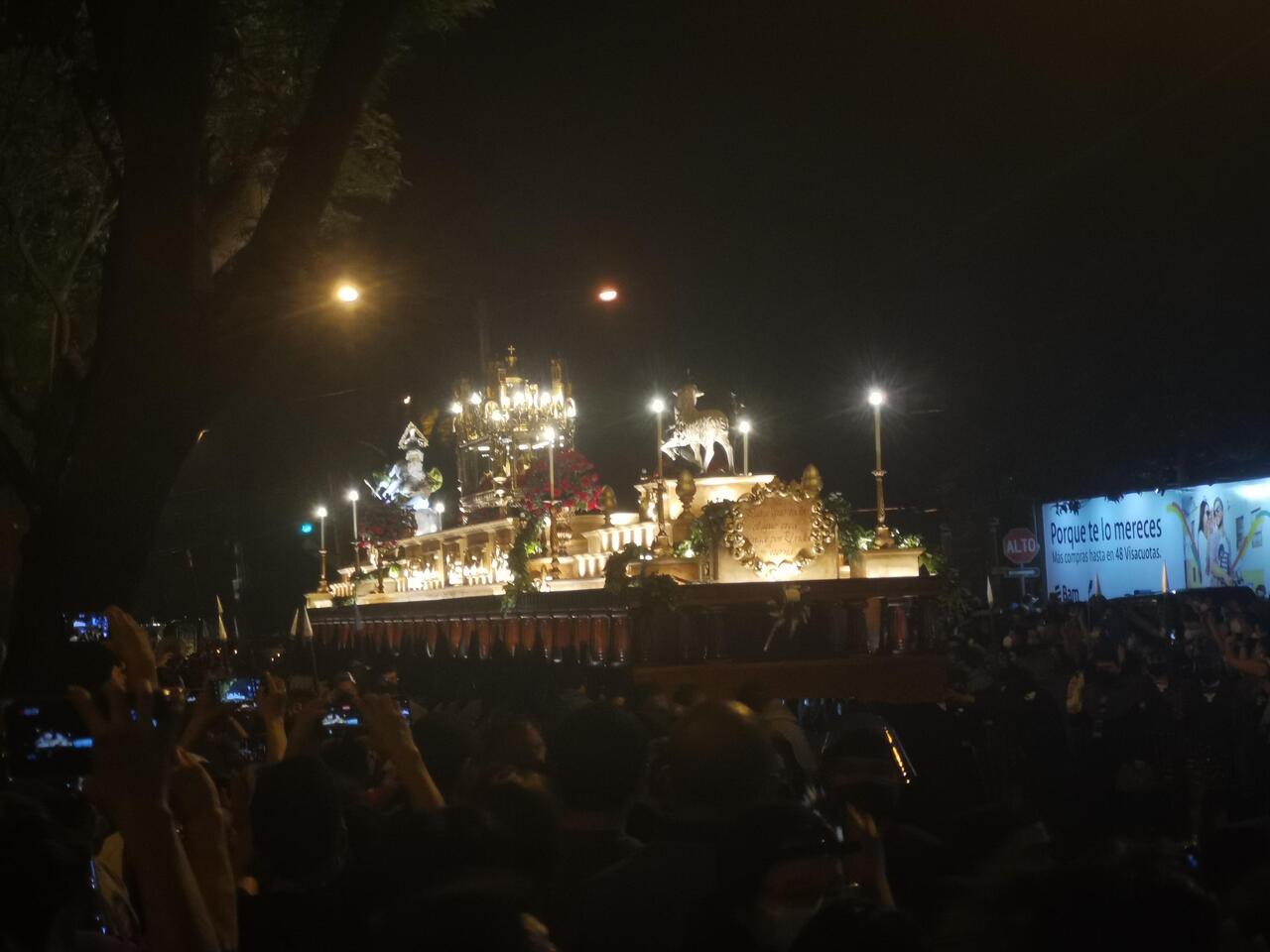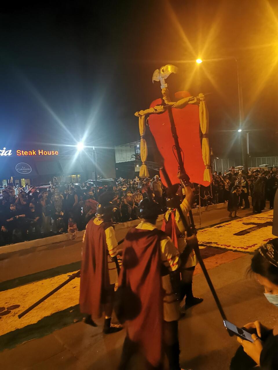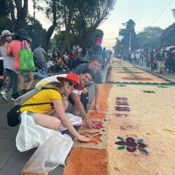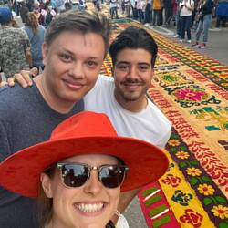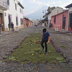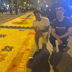 Für die zweite Prozession am Abend wurde die Hauptstraße gesperrt. Zahlreiche Freiwillige legen "Teppiche" aus bunten Sägespänen aus, über die die Prozession dann läuft.