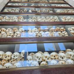 Hier sind die Schädel aller gefunden Opfer (ca. 9.000) aufgebart. Die Exhumierungen wurden inzwischen gestoppt, viele der Opfer befinden sich noch in den Massengräbern.