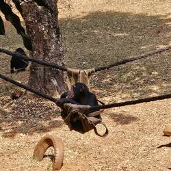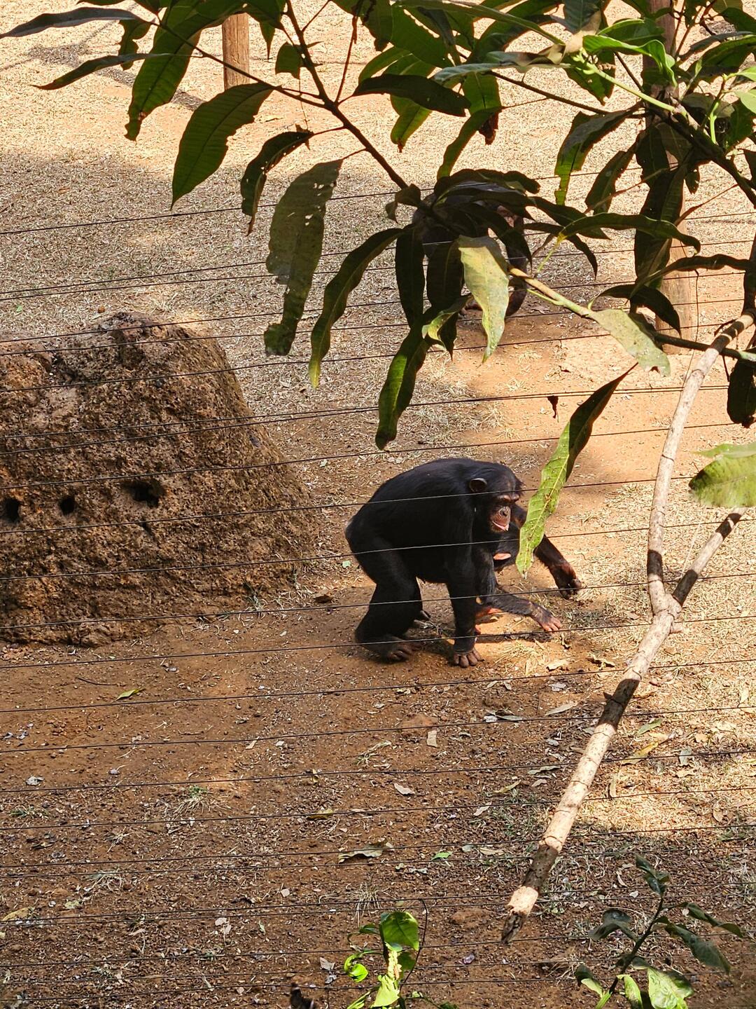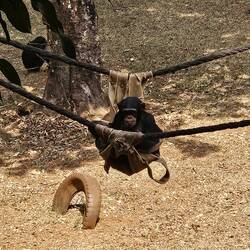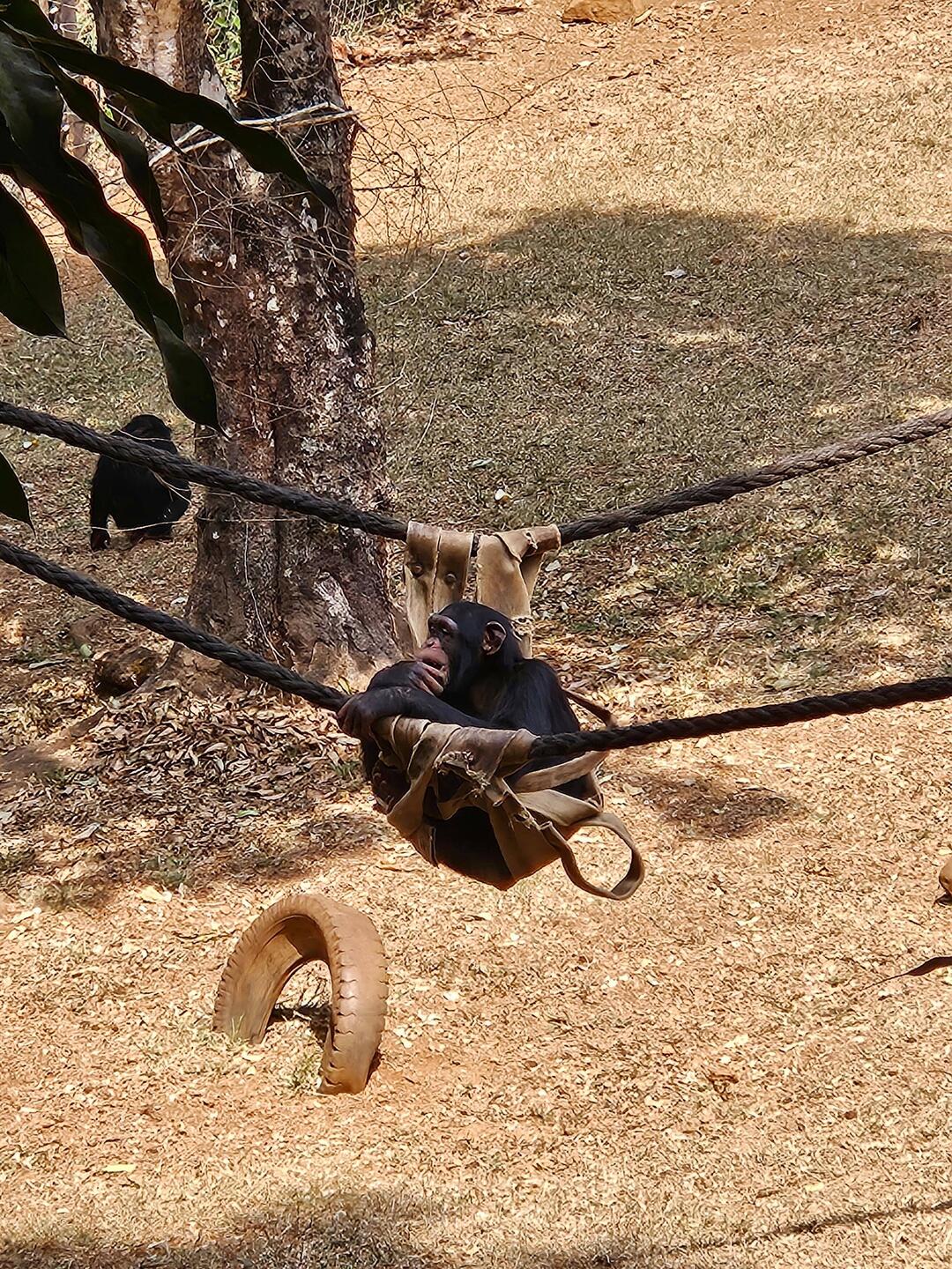 Die Jungtiere werden oft aus Privathaushalten gerettet. Sie leben in einem großen Gehege, um sich an Artgenossen zu gewöhnen und typische "Schimpansen-Skills" zu erlernen.