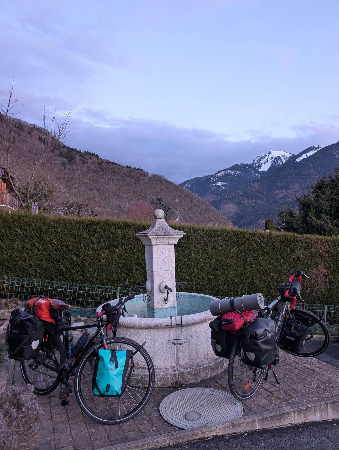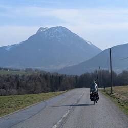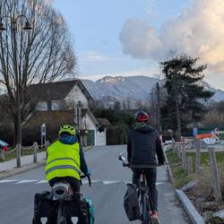 Vous déjeunez avec Bernie avant de vous remettre en selle pour attaquer la montée du col de Leschaux. Vous croisez foule de cyclistes, et vous en doublez même certains !! La montée est longue (11 km) mais pas très raide (4-5%) et la vue qui vous accompagne tout du long assez merveilleuse pour vous faire oublier vos cuisses qui commencent à chauffer. Les Bauges vous accueillent à bras ouverts. Après le col, ce n'est que du kiffe, le poids de vos vélos joue maintenant en votre faveur et vous fait dévaler les Bauges sans effort. Vous vous arrêtez en route acheter du Margeriaz (un fromage local) que vous dévorez avec du pain aux olives. Ça vous requinque avant d'entrer dans Aix-les-Bains.