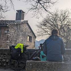 Eh oui, quand la pluie s'invite, c'est tout de suite moins rigolo de planter la tente. Cette dernière est d'ailleurs trempée, toujours bien fixée à ton porte bagage arrière, Ben. Vous optez finalement pour une chambre dans une petite auberge à quelques km de Toulon, au dessus (littéralement) de la grotte Sainte-Marguerite. Vous voilà donc reparti·es sous la pluie qui n'en démord pas. Alors que l'orage continue, vous vous affairez à faire sécher corps et affaires dans notre cocon du soir.