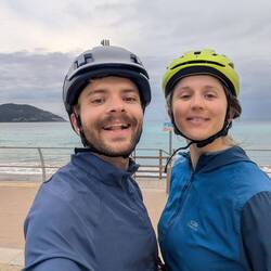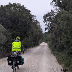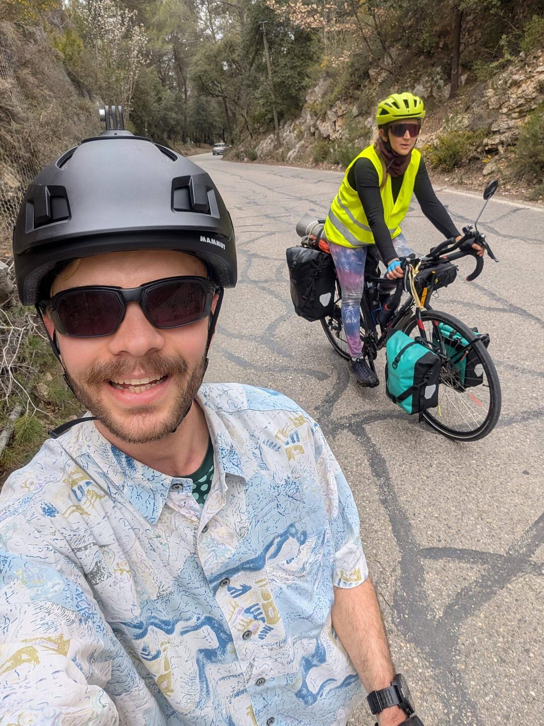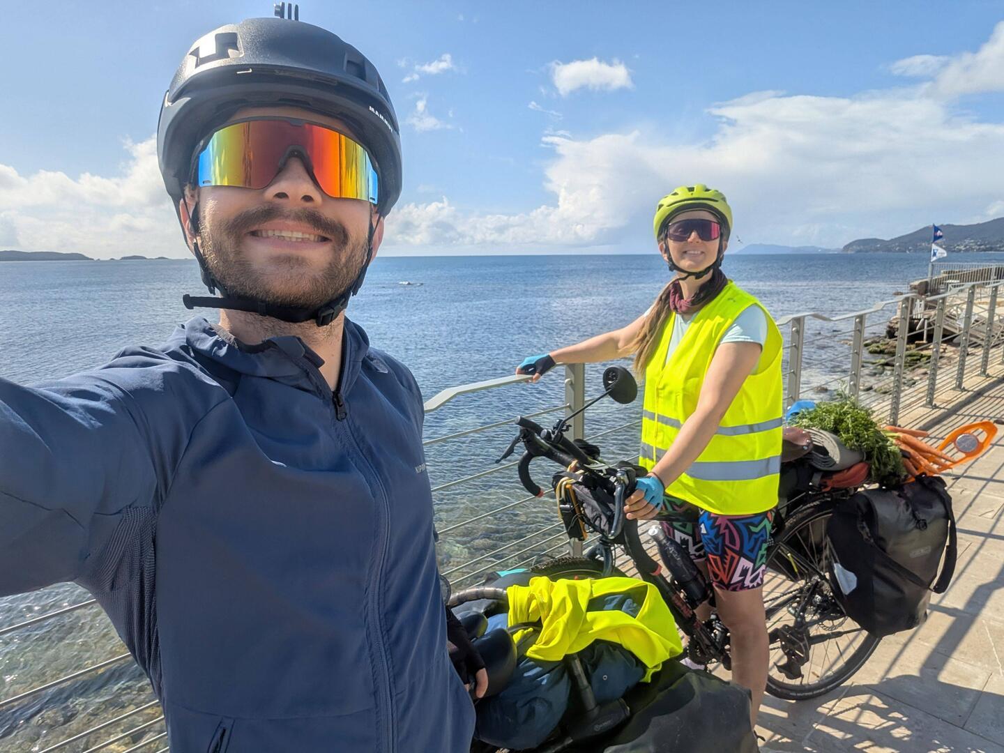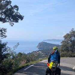 A la suite de ton second réveil Alice, tu te lances dans une séance de yoga with a view, pendant que Ben essaye de ranger ses affaires efficacement. Le tapis de yoga se transforme en table de petit déjeuner, et en peu de temps vous voilà prêt·es à partir. Le temps d'une vidéo pour souhaiter un joyeux anniversaire à René et vous enfourchez vos fidèles destriers pour descendre rejoindre la mer. A peine quelques km plus loin, vous la quittez de nouveau pour monter à travers une belle forêt de pins. À moins que ce ne soit les jardins des énormes maisons que vous apercevez parfois ? Ici, pas de chemins forestiers : que des chemins privés !