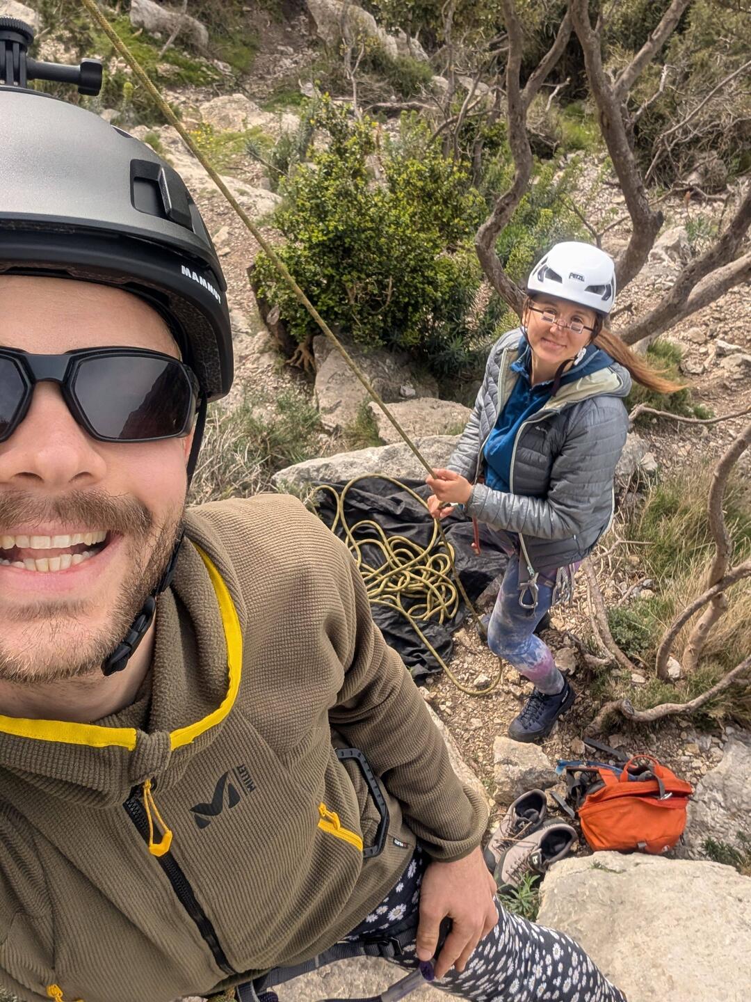 Paré.es de vos plus beaux leggings, vous trouvez votre chemin grâce aux supers photos de Clotilde (merci à elle !). C'est Alice qui ouvre le bal et posera les cordes, car Ben tu te remets de ton entorse de cheville. Vous avez su apprécier bien des aspects de cette session escalade, à commencer par la vue qui est splendide ! Alice, tu galères pour avoir assez de dégaines pour finir cette voie de 35m tout pile (ric rac pour votre corde). Ben, tu essayes ta caméra en conditions d'escalade, après l'avoir arborée fièrement sur ton vélo depuis le départ.