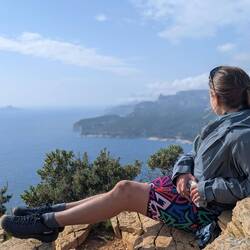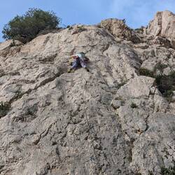 Traverser Marseille un samedi, de jour, sans sacoches, ça vous a presque paru trop simple. La route est belle, vous longez la côte Marseillaise. Vous arrivez sans encombres aux Goudes, cet endroit si magique alors que si proche de la ville. Vous retrouvez tous deux une des premières grandes voies que vous avez faite, petit moment nostalgique. Vous vous mettez vite en quête du spot de grimpe repéré sur le topo prêté par Roxane. Quelques minutes de marche plus tard à travers la garrigue, vous le trouvez sans problème. Les problèmes, vous en trouvez sur la falaise, entre la première voie « patinée » (rendue glissante par des générations de grimpeur·euses) et la seconde qui vous fera bien réfléchir. En tout cas, c'est beau, vraiment très beau. Le paysage autant que la grimpe.