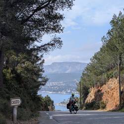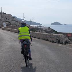 Première étape, le col de la Gineste. Pourtant fortement fréquenté par les cyclistes marseillais·es, la piste cyclable ne commence qu'à la moitié de la montée et se résume à une bande marron sur le côté de la route. Heureusement, le vent est clément, et surtout la route est vraiment belle : elle se hisse progressivement au dessus des calanques et vous offre un bien beau panorama. Vous apercevez même vos Goudes ! Vous vous en sortez comme des chef·fes : la Gineste numéro 1 de la journée est achevée !