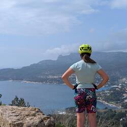 La descente vous ramène au niveau de la Méditerranée que vous longez un temps avant de quitter Patrick pour vous engager sur un chemin de terre, option GRAVEL BIKE. Ça monte ! Alice tu fais de ton mieux mais tu craques et pousse ton vélo quand les pierres se font trop grosses. Ben, tu assures tout du long, un vrai vttiste ! Vos coups de pédale vous amène à découvrir une étrange énorme statue : Notre-Dame d'Afrique. Vous montez encore pour aboutir au sommet où vous pique niquez votre super repas de la veille, à l'ombre avec vue sur ces beaux rochers ocres.