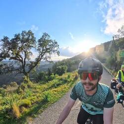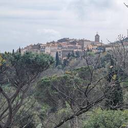En prenant de l'eau à une fontaine, vous rencontrez un cycliste qui vous conseille chaleureusement de prendre la route des Crêtes (une autre !). Après une pause midi à base d'un excellent pain aux noix, vous vous lancez donc à l'assaut du village de Bormes les Mimosas : c'est bien raide ! Arrivé·es en haut, vous vous offrez un goûter digne de ce nom dans un café avec une terrasse panoramique. C'est beau, ça fait du bien. Le ventre plein, vous repartez silloner la route des Crêtes : c'est magnifique, vous enchaînez les points de vue sur les différentes baies et leurs îles avant de toutes les dominer en même temps. La forêt qui vous entoure est elle aussi très belle, pleine des chênes lièges si chers à Ben. Les couleurs du couchant vous accompagnent avant de laisser la place à une brume dense crépusculaire qui vous aveugle quelque peu.