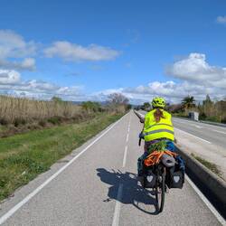 Puis vous foncez en direction de Hyeres les Palmitos. Foncer, c'est ce que vous pensiez faire aujourd'hui car le trajet était globalement plat. Mais c'était sans compter sur votre ami le vent, qui vient vous conter en pleine face qu'il vient de l'est. Alors vous luttez un peu, mais la route est belle et agréable : une piste cyclable relie Toulon à Saint Maxime, vous êtes donc protégé·es. Vous traversez des marais salants avec des flamands roses qui vous rappellent la maison. Vous pédalez sur des routes avec parfois d'énormes flaques d'eau, des bouches d'égouts qui débordent, vestiges des averses de la veille. Un·e automobiliste t'éclabousse, Alice. Vous longez une mer brunâtre, témoin de la propreté de nos villes... Vous réalisez que vous avez bien fait, hier, de trouver refuge dans ce centre commercial puis dans cette auberge.