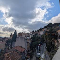 L'objectif de cette côte ? Le village de Ramatuelle et ses jolies maisons de couleur surplombant la baie de Saint-Tropez. Arrivé·es la bas, vous vous mettez en quête d'une boulangerie. La seule du village ne propose plus rien de végétarien (après le passage du client précédent qui a tout raflé sans scrupule), vous redescendez donc le ventre vide en direction de Port Grimaud, où vous trouvez une boulangerie tout à fait acceptable bien qu'en bord de route. Alice, tu te régales de caneloni ricotta épinards, attendant avec impatience l'Italie qui n'est plus si loin. Au moment de partir, quelques gouttes tombées du ciel menaçant vous feront regarder le radar météo. Vous passez donc la demie heure suivante dans le PMU d'à côté, au sec, à regarder la pluie tomber à verse. Quelle chance, merci à Kéké (c'est vraiment son nom, pas de mauvaise blague) de vous avoir recueilli·es, vous et vos vélos !