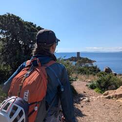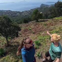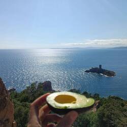 Après un petit déjeuner digne d'un hôtel et une dégustation de tous les chocolats Ethiquable existants, vous faites vos adieux à Sylvie et Pascal en les remerciant bien chaleureusement. Vous filez vers l'Esterel, tout heureux·ses et les jambes affamées ! En chemin, vous rencontrez Patrick qui se met en tête de vous présenter son terrain de jeu. Alors, vous le suivez ! La route est merveilleuse, direction le Mont Vinaigre, les rochers ocres se succèdent puis la mer vous tend ses bras. C'est décidément un paysage à la fois digne des plus grands parcs américains et d'un décor de film, ce que ne manque pas de vous rappeler Patrick ! C'est vrai que c'est vraiment très beau.