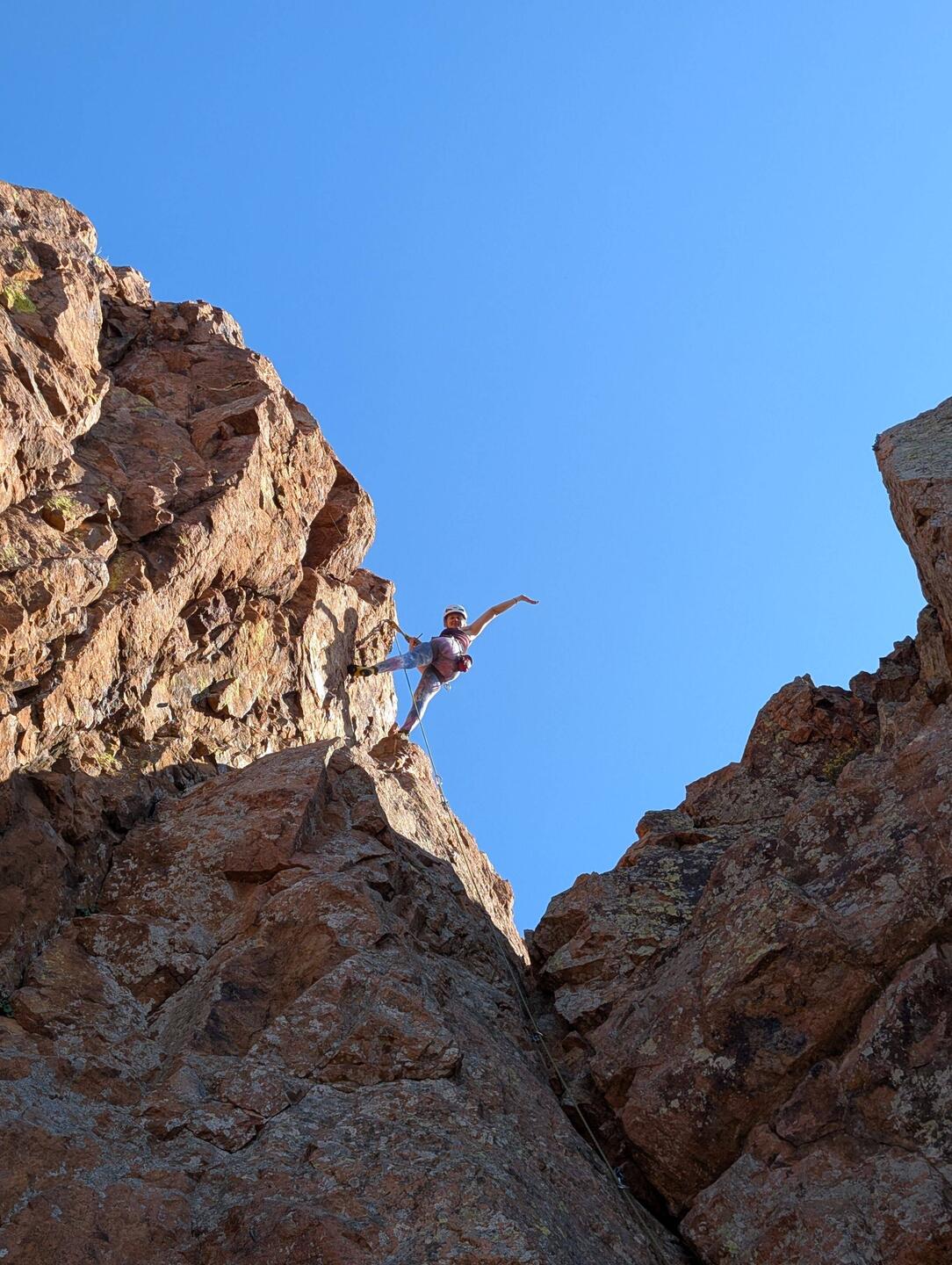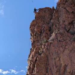 C'est donc ici que vous allez passer toute votre journée. Ah non, juste l'après midi parce qu'il est déjà 13h quand vous y arrivez, oups, ce qu'on est lent quand chaque déplacement implique de déplace sa maison avec soi... Vous grimpez une chouette voie en dièdre qui vous amène au sommet d'un des blocs de rhyolite qui compose ce site de grimpe. La vue est splendide. Elle l'est tout autant en bas, où vous vous offrez un chouette pique nique (avec notamment un avocat d'Espagne qui te manquait tant, Alice). Puis vous repartez à l'assaut de LA voie du secteur : le pilier du soleil. Elle porte bien son nom, il s'agit en effet d'un pilier à gravir : qui dit pilier, dit gros gaz ! Vertigineuse à souhait, c'est Ben qui s'y colle en tête car Alice est quelque peu terrorisée (et ce même en moulinette). Mais l'ascension vaut le détour, la grimpe y est belle et la vue encore plus.