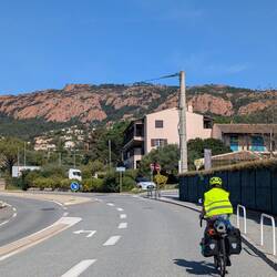 Vous vous dépêchez de repartir dès que la pluie s'arrête, réussissant à traverser le golfe de Saint Tropez avant la prochaine averse. À Sainte-Maxime, la piste cyclable s'arrête. S'ensuivent alors de loooooongs kilomètres, coincé·es entre la mer et la départementale. Les voitures passent et se ressemblent, sans toujours respecter les distances de sécurité. Quelques portions vous permettent tout de même de prendre un peu de hauteur et de respirer. Vous retrouvez rapidement votre départementale chérie pour rouler jusqu'à Saint-Raphaël.