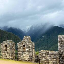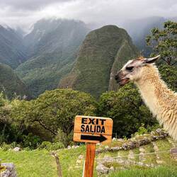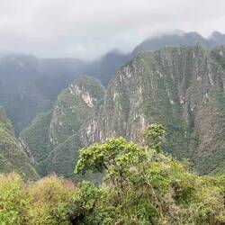 We descend from the train into a small touristy town that sits just below the Machu Picchu site. We are up before 5am the next morning to catch a 6 am bus for our 7 am entry. It is absolutely pouring it down. Once at the top we manage to find ourselves a guide. We will tour the main site for a couple of hours with him, then climb the Waynu Picchu mountain behind the far end of the site, and finally return through the ruins to the exit. The tour with the guide is damp and whilst we can see the ruins, everywhere else is in the cloud.