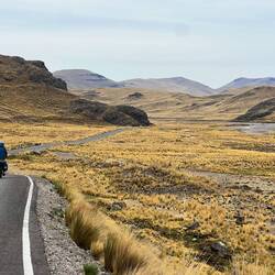 Today is a downhill day! A good thing as we have 70km to cover and we are tired from the previous few days. The wonderful gorge scenery with occasional Puya Raymondii continues for a while until the vallley widens into a great flat plain leading towards lake Titicaca. After so many months of mountains and canyons, flat seems really quite strange. And Nice!! The kilometers pass surprisingly quickly. There are still many herds of Alpacca and sheep. Endearingly, one by one the Alpaccas raise their heads from the grass to give give us a quizzical stare as we pass.