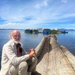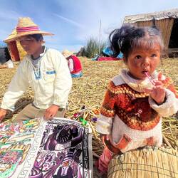 We have arranged with Felix, our host, to visit one of Lake Titicaca’s famed floating reed islands. We leave at 7.30am and an hour later arrive at a tiny floating island. It is only 10 metres across and covered in dried totora reeds. It is soft, damp and springy and moves beneath our feet - giving the impression of being a house boat as much as an island. We are seriously taken aback by how small it is.