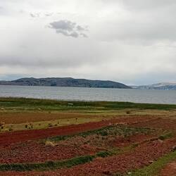 Leaving Juliaca is a complicated business, the recommended street is fully occupied with a market and the pace is very slow. Finally we manage to turn off towards the Capachica peninsula, thus avoiding the other big town of Puno. Sadly, this begins with 20km strewn with thrash. Things get better as we arrive in the peninsula and after a little hill we get our first sighting of LAKE TITICACA!!!