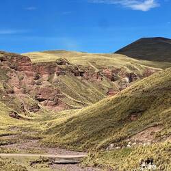 After leaving our beautiful night spot near a lake at 4230m, we descend gently in sunshine, until we reach a great flat valley. Apart from a few isolated farms, it is very empty. The first junction connects to a single track, tarmacked road in a similarly wide flat valley that we are heading up and which is surrounded by volcanic rock formations. The valley has several deserted settlements; posters advertise plots of land for sale to rebuild a town.