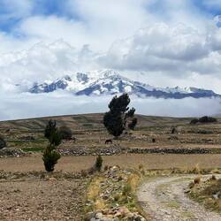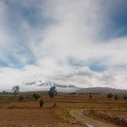 A beautiful day arrives and we take off. Our next stage is to pay a visit to the giant of Cordillera Real, Ancohuma, 6427m, now less than 30km away. As soon as we are out of town, the glaciers shine proudly and show us the way. Quickly we are in the countryside on a network of rather cobbly dirt roads. Local peasants wave us very kindly and the scenery is grand.