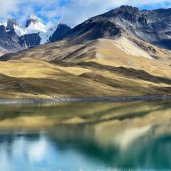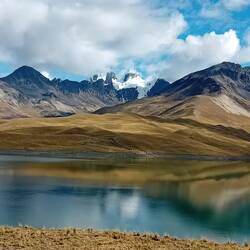 After a false start from Palcoco (a lost and retrieved waterproof story), we have an uneventful dirt road climb (no dog, no near miss, no rain etc.) up the valley. The mountain range in front of us gently plays with the clouds. A mesmerizing very sharp peak is shining beautifully at times, which in hindsight we identify as Nevado Condoriri (5648m). As we reach precisely 4500m, Lago Tuni appears for the first time.