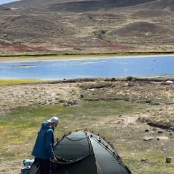 Since we started near 3850m and the pass at the foot of the mountain is only around 4500, the climb is not so serious, but the cobbles and the patchy dirt road fixes make it difficult. We reach the pass soon after midday - but the great Mt Ancohuma has decided to cover itself with threatening clouds. The wind starts to rage. We decide to base ourselves near a little lake and pitch the tent before getting soaked.