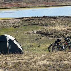After a day of rest in the quiet it is time to get moving. For starters, we are out of food. We head back the way we came to begin with - at least the rough road is now downhill and thus a little easier to navigate. Though there are many large ponds and small fords. Alice is still wobbling- so sacrifices dry feet for safety.