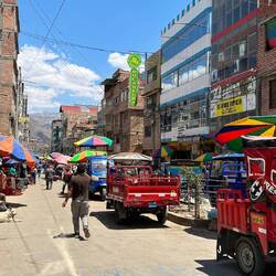 After our short trip to lower altitudes the mountains were calling us again: Our next destination was Huaraz, the hiking capital of Peru and, as rumours have it, nicknamed „the little Switzerland of Peru“. As we like to drive long distances by day to see some more of the country we were facing an 8 hour (scheduled) ride from Lima to Huaraz and were looking forward to it - well, not so much anymore after sitting in the bus, seeing all the windows being blocked by the bus decoration and being told multiple times that we are not allowed to eat during the 8 hours non-stop drive 🤷🏻♀️ (side note: luckily the seats in the bus were massive, so we were able to hide from the camera eyes of the staff behind our front neighbour back seats and still have some food, but boy, we were annoyed!). So, 10 (and not 8) not-so-relaxing hours later we arrive at Huaraz at 22:30 and go out to look for our hostel. As always, we did not really check out the city much in advance, thinking (as always) that a city with such a name among tourists will be touristy - OF COURSE we were wrong again 😄 So we started walking, got to our neighbourhood and our first impression happened to be just another half-built dirt-and-gravel road leading into a dark alley where our hostel was supposed to be… But it was, and we did not got robbed! Furthermore, it turned out that our hostel was in the superduper local area of the city and near the official city market which just happens to spill out into the streets of three or four more blocks, always busy, noisy and smelly, but - once you got used to it - it was also super interesting and exciting to run around between the colourful shouting women of the Andean Highlands and to inspect their goods!