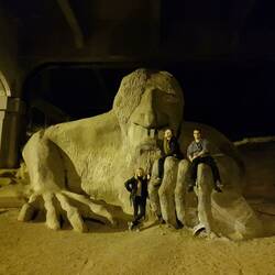 Wir fuhren von dort in ein Viertel dessen Namen ich vergessen habe. Irgendetwas mit F. Egal - es war jedenfalls ziemlich cool! Viele hippe, alternative und mit Lichterketten behangene Bars, Cafés & Restaurants! In einem davon tranken wir ein Bier (Bennett nur ne Cola) und teilten uns zu dritt Gnocci mit Pesto & Süßkartoffelpommes. Anschließend gingen wir in das Café nebenan, auf dass uns Bennett schon ganz heiß gemacht hatte. Denn wie er meinte, sei es allen Inhabern in der Stadt erlaubt selbst zu entscheiden, ob im jeweiligen Restaurant Hunde mitgebracht werden dürfen oder nicht. Und in diesem ist es als einziges vom Inhaber gestattet. Wir haben uns dort zwar nicht niedergelassen - sind aber zumindest einmal durchgeschlendert und haben kurz mit ein paar von den süßen Vierbeinern geknuddelt. 🤩 Anschließend spazierten wir durch die beleuchteten Straßen, machten einen Halt an einer sehr großen verstörenden Steinfigur unter na Brücke 😅 aßen noch ne Kugel Eis und tranken dann noch ein zweites Bier in einer sehr coolen kleinen Bar, dessen Besitzer wohl ein Faible für Glücksspiele hat, denn überall waren Spielautomaten aufgestellt. Wir hatten Bennett schon den Tag zuvor gefragt, wieso genau er eig kein Alkohol trinken durfte - sind dabei aber irgendwie auf ein neues Thema gekommen. Die Frage kam also erneut auf, und die Antwort hat uns beiden komplett die Sprache verschlagen.. Er hat im Juni ein Teilstück seiner Leber einem fremden Baby gespendet.. Den Tränen nahe, konnten wir gar nicht glauben was er da erzählte.. Als wäre es das normalste der Welt.. Im Laufe des Gesprächs stellte sich Außerdem heraus, dass er vor zig Jahren auch eine Niere gespendet hat.. Ebenfalls an jemanden, den er persönlich nicht kannte. Unglaublich. Uuuunglaublich! Für einen meiner liebsten würde ich das ohne zu zögern auch tun.. Aber für jemanden zu dem man keinerlei Beziehung hat..?! Tatsächlich mal auf jemanden zu treffen, der sich genau dafür entschieden hat ein Stück seines Körpers einem anderen fremden Menschen zu überlassen und all die Risiken, Umstände oder Konsequenzen in Kauf zu nehmen, ist einfach überwältigend.. Zumal erst im Dezember seine Mama gestorben sei, er hatte es also nicht leicht die letzten Monate. Während wir so darüber sprachen, konnt ich meine Tränen vor Rührung nicht mehr zurückhalten und um MICH zu trösten, nahm ER mich in den Arm. 😅 Dann sagte ich ihm, was mir Anfang des Jahres meine kleine Cousine erzählt hatte😅: "Energie geht nicht verloren, sie ändert nur ihre Form." Ein Gedanke, den auch er wunderschön fand. Puml kämpfte währenddessen auch mit den Tränen, ist aber mit zu viel Emotionalität in der Öffentlichkeit überfordert. Letztlich lagen wir uns aber dennoch zu dritt in den Armen. 😂 Ein sehr emotionaler Abend, den wir erneut im Whirlpool seines Fitnessstudios ausklingen ließen.. Wir zogen unsere Badeklamotten bereits bei Bennett zu Hause an, und ich ließ ausversehen meine Unterwäsche in seinem Bad liegen. Ne viertel Std später, übergab er sie mir als Geschenk verpackt zurück.😂 Und auf der Fahrt zum Fitti gab ihm die Aktion auch noch Anlass vor sich hinzusummen und mit der Melodie von Jingle Bells einen Song zu dichten: