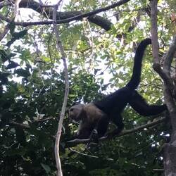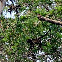 -howler familie vlak aan de parking, toekans die overvliegen, krokodil in het water..