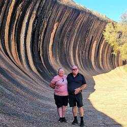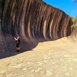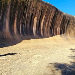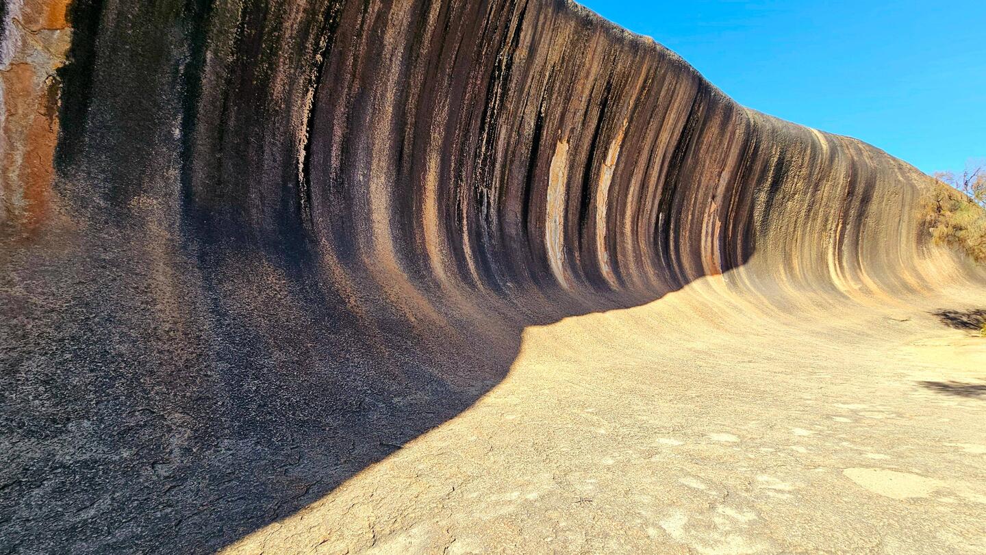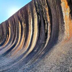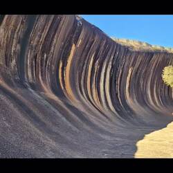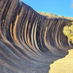 Wave Rock is a natural rock formation that is shaped like a tall breaking ocean wave. The "wave" is about 15 m high and around 110 m long. It forms the north side of a solitary hill, which is known as "Hyden Rock". This hill, which is a granite inselberg, lies about 3 km east of the small town of Hyden and 296 km east-southeast of Perth, Western Australia.