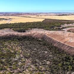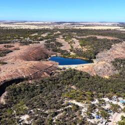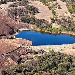 A wall lies above Wave Rock about halfway up Hyden Rock and follows the contours of the rock surface. It collects and funnels rainwater to a storage dam. The wall and dam were constructed in December 1928 by the Public Works Department for the colonist settlers of East Karlgarin District. Both were renovated in 1951 to increase water capacity for the Hyden township.