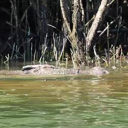 Wir fahren durch den Ort Cape Tribulation und kommen am Kulki Beach an. Ein sehr malerischer Strand mit Palmen an der langen Seite und Mangroven am linken und rechten Ende.