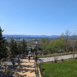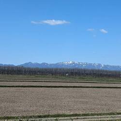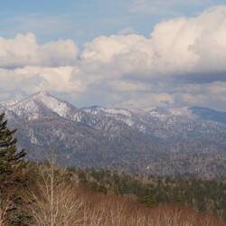 Wir haben schon aus dem Zug heraus die Landschaft bewundert. In einiger Entfernung erheben sich die noch schneebedeckten Berge des Daisetsuzan-Nationalparks. Vorne Frühling mit hier und da noch Kirschblüten an den Bäumen und da hinten die schneebedeckten Berge. Das ist schon sehr beeindruckend.