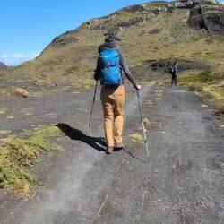 Nachdem wir uns den Wasserfall angeschaut haben (nur so mäßig spannend), wollen wir zum Mirador Cuernos laufen. Gleich nach dem Wasserfall ist ein Stück, dass nicht vor dem Wind geschützt ist. Als wir rüberlaufen, kommt eine ziemlich heftige Böe die uns, und auch andere, von den Füßen holt. Andreas kann es ganz gut ausgleichen und kniet sich mit dem Rücken zum Wind auf den Boden. Katti muss sich leider mit den Händen abfangen und zieht sich auf den scharfen Steinen eine kleine Schürfwunden zu. Mit der Böe kommt auch eine ganze Menge Staub und kleinere Steine, die uns gegen den Rücken prasseln.
