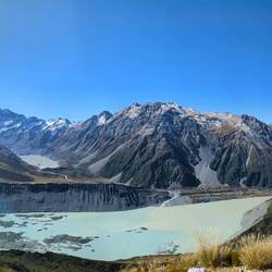 Wir bekommen zum Glück auch nochmal wieder einen Platz in der ersten Reihe. Die Sonne scheint, die anderen Camper sitzen alle draußen. Wir haben uns bei der Wanderung allerdings schon etwas zuviel Sonne eingefangen und bleiben zur Sicherheit im Camper und genießen die Aussicht von dort. Wolkenloser Himmel, mit einwandfreiem Blick auf den Aoraki. Das Wasser ist auch sehr ruhig, sodass sich die Bergkette darin spiegelt. Einfach toll anzuschauen!