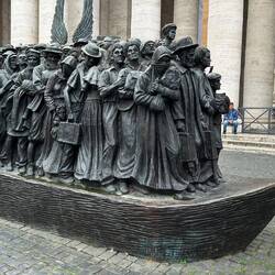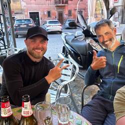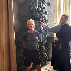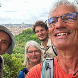 旅行者VF Tag 44 La Storta -Rom Vatikan ROMA Spedale Divina Provvidenza di S.Giacomo e S.Benedetto Labre - Via dei Genovesi, 11B, Trastevere - +39 3272319312 -353 4286139 Spendenbasis Fußwaschung, gemeinsames Abendessen, Oscar schenkt allen ein selbst designtes Batch 4 holly doors Jean Claude ex swiss guard 2002 lie Asissi -Rome Letzter tag, wir sind zu sechst. Ellen und Jordi aus NL, Mauro, Guliano und Lukka aus I und meine Wenigkeit aus D. Heute ist erstmal wieder Autos Wer nach Rom Pilgert, für den ist mit dem Besuch des Petersdom und dem Erhalt des Pilgerzertifikates die Pilgerreise eigentlich zu Ende. Doch ist sie offiziell erst beendet wenn alle vier Kirchen mit dem Durchschreiten der dortigen heiligen Tür besucht wurden um dadurch den wirklichen Ritterschlag zu erhalten. Da wir gestern Mittag an einem Mittwoch und somit dem Audienz Tag des Papstes in Rom ankamen wimmelten naturgemäß 500 Millionentausende Menschen auf dem Petersplatz, im Petersdom, auf der Straße zur Engelsburg und sowieso ganz Rom emsig wie Ameisen plan- und ziellos umher. Uns selbstverständlich inbegriffen. Im Zeitraffer: planloses suchen nach dem Ort, an dem wir unser Pilgerzertifikat bekommen, Hinweis: bei der Warteschlange beim Sicherheitscheck zum Petersdom anstellen, einreihen in die Warteschlange zum Einlass in den Petersdom, vorzeigen unserer „Greencard“ (Pilgerausweis) einer freundliche Ordner Dame diese wies uns an rechts an der Schlange vorbei zum Sicherheitscheck für VIP’s zu gehen. Dort die Erlaubnis erhalten unsere Rucksäcke bei den Sicherheitsleuten zu deponieren. Pilgerbüro > Pilgerzertifikat > einreihen in die Warteschlange zur heilige Tür des Petersdoms und durchschreiten der Selben (wir befinden uns im heiligen Jahr 2025 also ist diese offen, die nächste offizielle Gelegenheit dort durch zugehen wäre 2050) https://de.wikipedia.org/wiki/Heilige_Pforte . Im Strom der Menschenmassen durch den Petersdom treiben lassen.