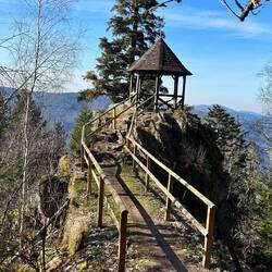 In’s Murgtal und etwas weiter der Latschigfelsen mit Aussichtshütte ebenfalls mit Blick in’s Murgtal.