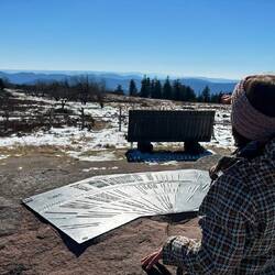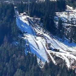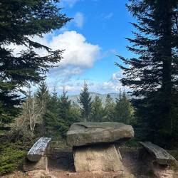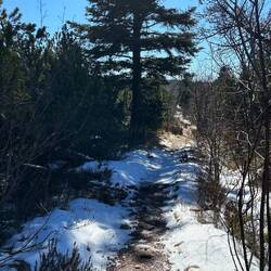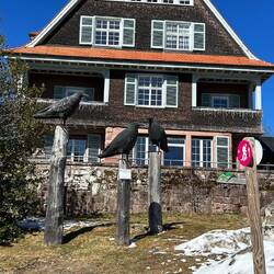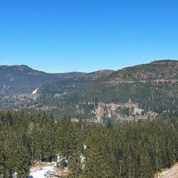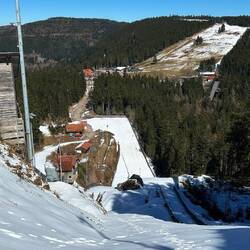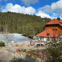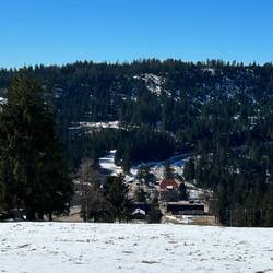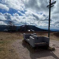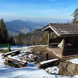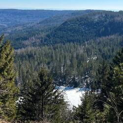 Zuhause einen Blick in den Himmel, geniales Wetter. Blick auf den Thermometer 0 Grad, also Ideale Bedingungen. Mit dem eAuto zum Mummelsee, Aussteigen und Arghhhh Ostwind vom feinsten gefühlte -10Grd. in windgeschützten Ecken waren es dann wieder die 0 Grad also weiter. Ich war erstaunt als wir am Seibelseckle dort noch Schnee auf der Skipiste zu sehen und zwar soviel dass dort jede Menge Skifahrer rauf und runterrutschten. Ringsherum herschte vorwiegend grün vor. Der Westweg verläuft vom Seibleseckle ein lange auf breiten Waldwegen worin er sich von den anderen Fernwegen des Schwarzwaldes im Nordteil in nichts unterscheidet. Um meine Aussage Lüge zu strafen gibt es aiuch wirklich schöne Passagen auf schmalen Wegen, welche jetzt im Winter mit einem Schneeschuh Wanderweiser ausgezeichnet sind. auch auf den Der Schnee war hart und somit gut zu gehen. Auch fehlt vom Seibelseckle bis zur Darmstätdter Hütte die rote Raute des Westweg Wanderzeichen, nur ein kleiner Richtungspfeil auf einem Holzpfahl weist den Weg den auich meine Garmin zeigt. Wir folgen nun der gelben Allerweltsraute. Der Westweg verläuft hier bis zu Alexanderschanze immer irgendwie parallel zu B500 mal weiter entfernt mal direkt parallel. Um diese Jahreszeit nicht sonderlich störend. Im Sommer dagengen ist der Motorradlärm mehr als störend. Nach einer guten Stunde freuten wir uns auf eine Tasse Kaffee, aber leider umsonst die Darmstädter Hütte hatte diesen Dienstag geschlossen. Die Enttäuschung war nur kurz anhaltend den jetzt wurde es richtig schön und Ahaaaa das Westweg Zeichen ist wieder da und leitet uns auch prompt in einen schmalen steinigen Pfad (mein Ding) bis zu einem freien Aussichtsplatz, dem Eutinggrab, mit Blick auf den Wildsee den man heute leider nicht sehen konnte, er war unter einer schönen weißen SchneeEisdecke eingehüllt. Was in seiner schlichten Ausstrahlung seiner Schönheit nicht abträglich ist. Ein wenig weiter schon blickt man über den schneelosen Skihang (Südhang) des Ruhesteins mit seinem Naturparkzentrum und seinen Sprungsschanzen im Hintergrund ins Blickfeld.
