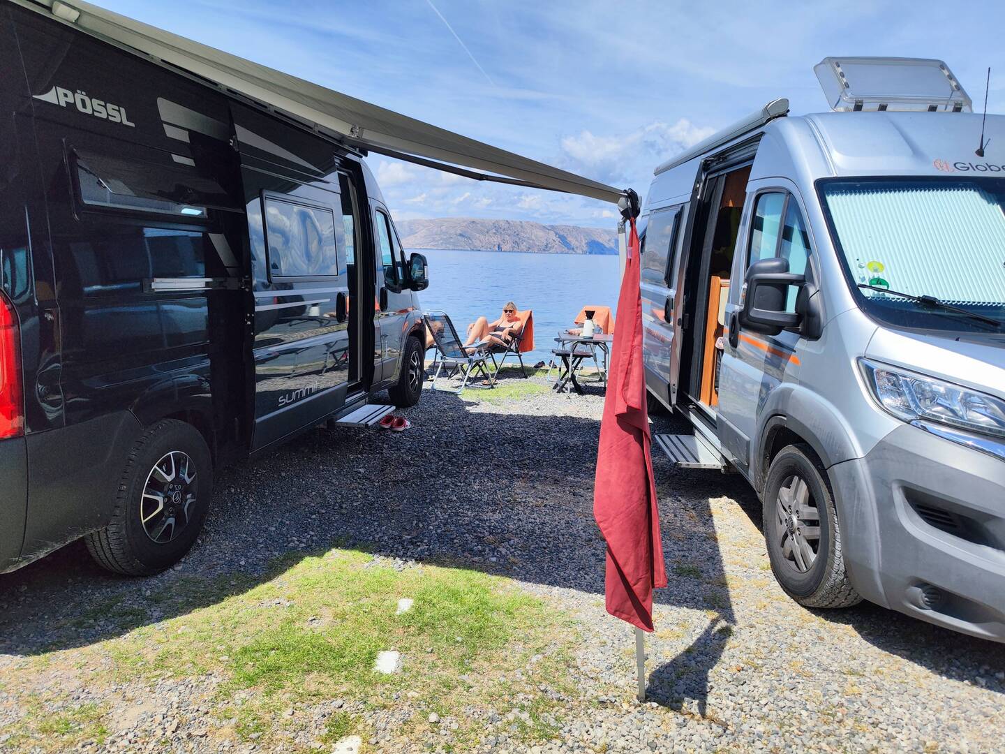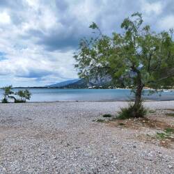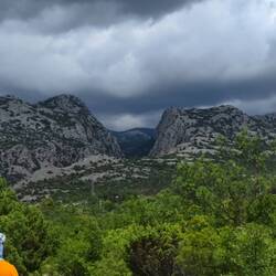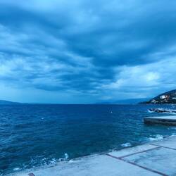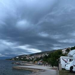 Wir haben alles richtig gemacht und sind rechtzeitig aus der Ecke von Rijeka abgehauen bevor das Unwetter kam. Hier in seline sehen wir zwar die dunklen Wolken in den Bergen aber die Sonne scheint.